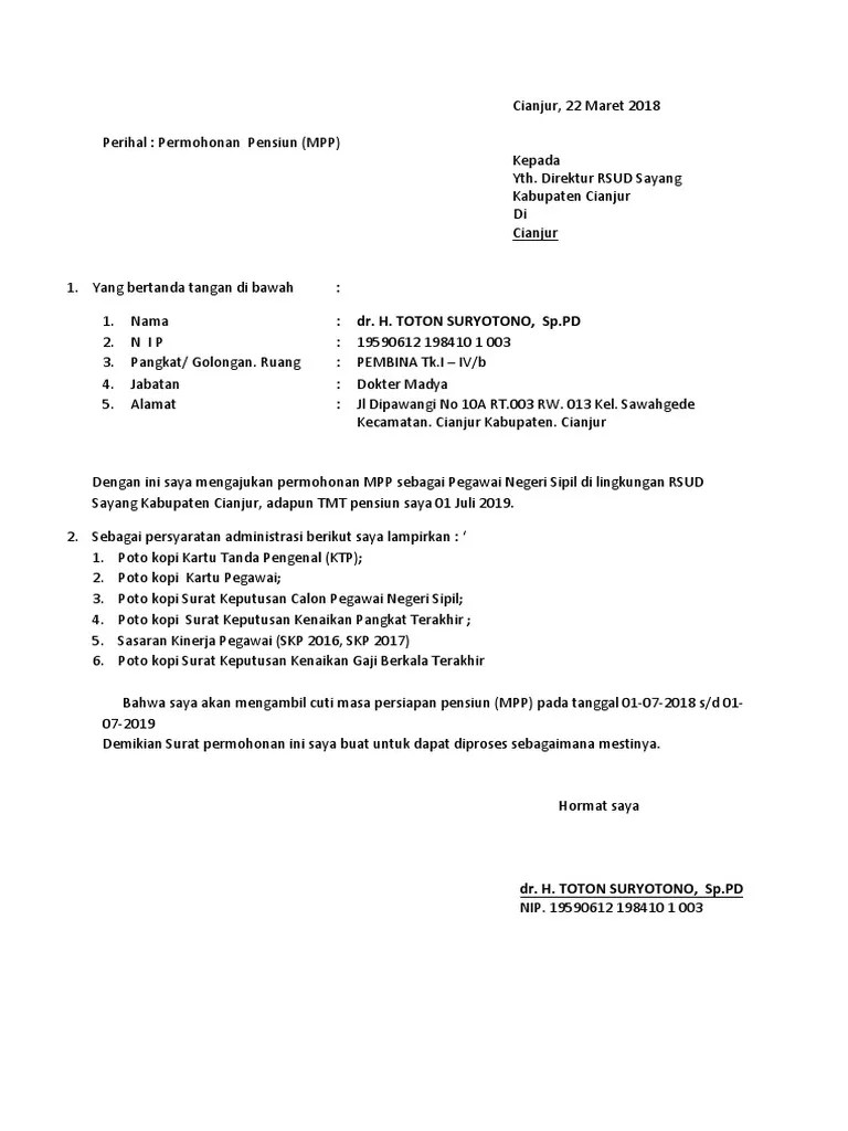 Data perorangan calon penerima pensiun (dpcp) yang ditandatangani pns bersangkutan dan pimpinan skpd; Contoh surat pengajuan pensiun dini. Apa saja dasar ketentuannya, bagaimana prosedur pengajuannya? Penisun adalah masa dimana jabatan adapun kriteria penyakit yang dapat dijadikan alasan pengajuan permohonan pensiun dini apabila penyakit tersebut menghambat kinerjanya ataupun. Surat keterangan pensiun usia 60 contoh dari perusahaan swasta 17 rekomendasi baik benar dan yang disarankan 3 referensi kerja menarik download pengantar kepala sekolah untuk.