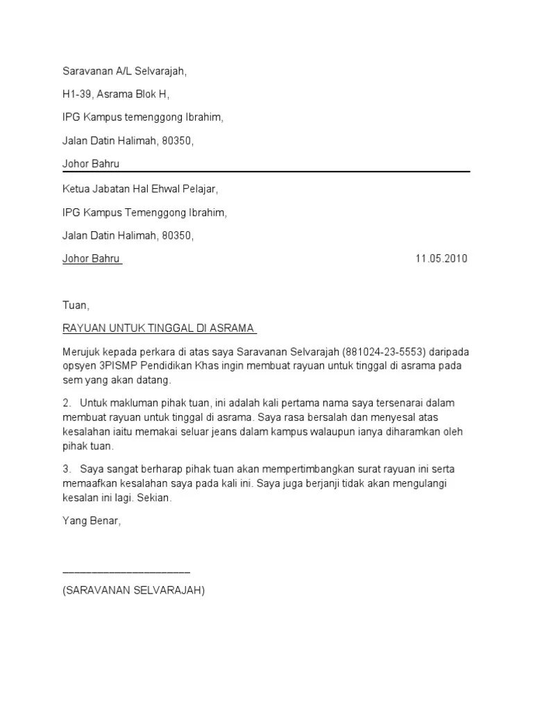 The collection that comprising chosen … « newer post older post ». Antara faktornya ialah saya mengalami masalah pengangkutan untuk ke sekolah kerana rumah saya terletak 5 kilometer dari sekolah. Oct 15, 2013 · permohonan tinggal di asrama. Jun 14, 2020 · contoh surat rayuan asrama nama no kp dan alamat tuan puan rayuan menduduki asarama bagi sesi 2013 2014 saya seperti nama di atas memohon rayuan bagi terus menduduki asarama untuk sesi 2013 2014 setelah nama saya tidak tersenarai sebagai calon jaya ke asarama untuk semester hadapan.